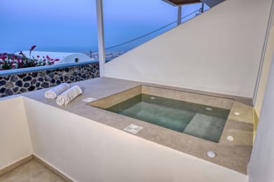 A charming and intimate suite featuring a private heated Jacuzzi and partial sea views, designed to offer comfort and serene relaxation. The soothing ambiance, inspired by calming Cycladic tones, enhances the cozy interiors, complemented by a comfortable double bed (or twin beds). A stylish cave-style bathroom completes the experience, creating an inviting retreat for couples seeking tranquility. Charming suite with private heated Jacuzzi and partial sea views.